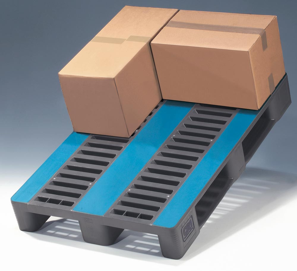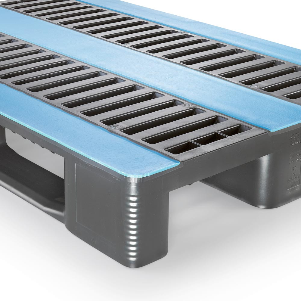 3-Kufen-Palette aus HDPE, rutschhemmende Oberfläche, Traglast stat./dynam. 7500/1500 kg, BxTxH 1200x800x160 mm, ohne Rand, Farbe grau/blau E834345