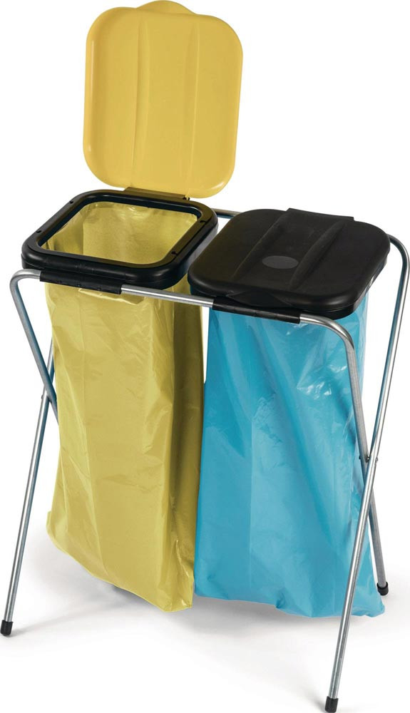 stationär oder fahrbar · für 20-130-l-Kunststoff- oder Papiersäcke · Stahlrohrgestell verzinkt · mit Klemmvorrichtung · Federdeckel oder Klappdeckel · blitzschnell aufgebaut · platzsparende Aufbewahrung