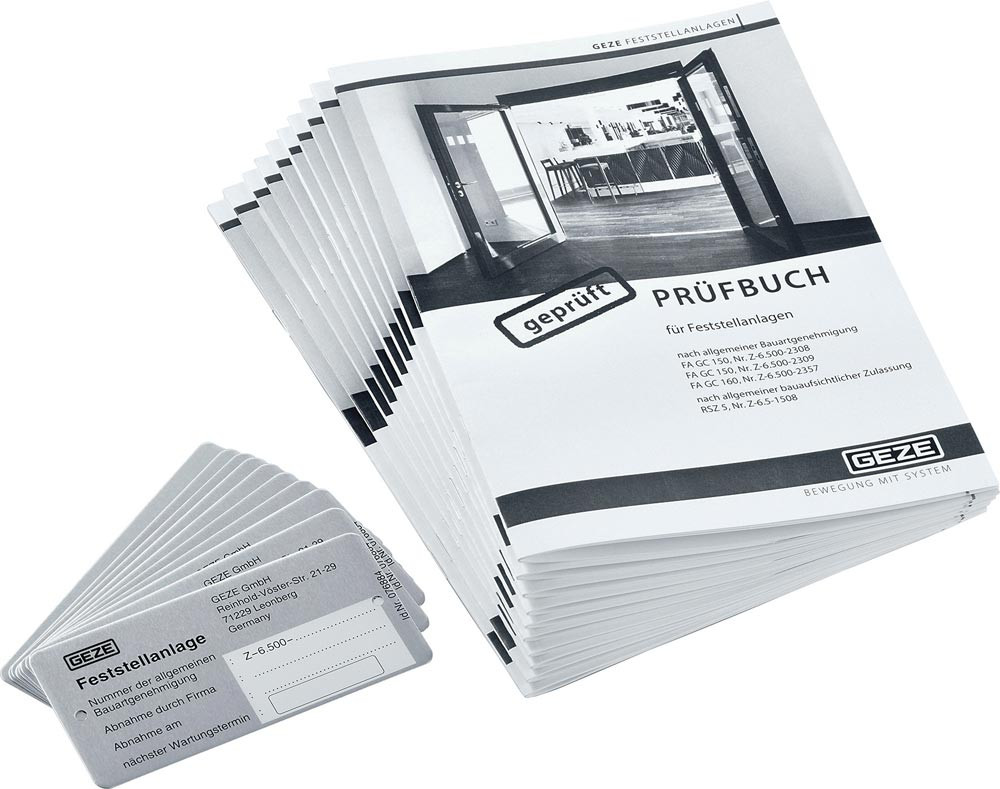 Abnahmeset Feststellanlage je 10x Prüfbuch, Schild, Aufkleber f. Abnahmeprüfung