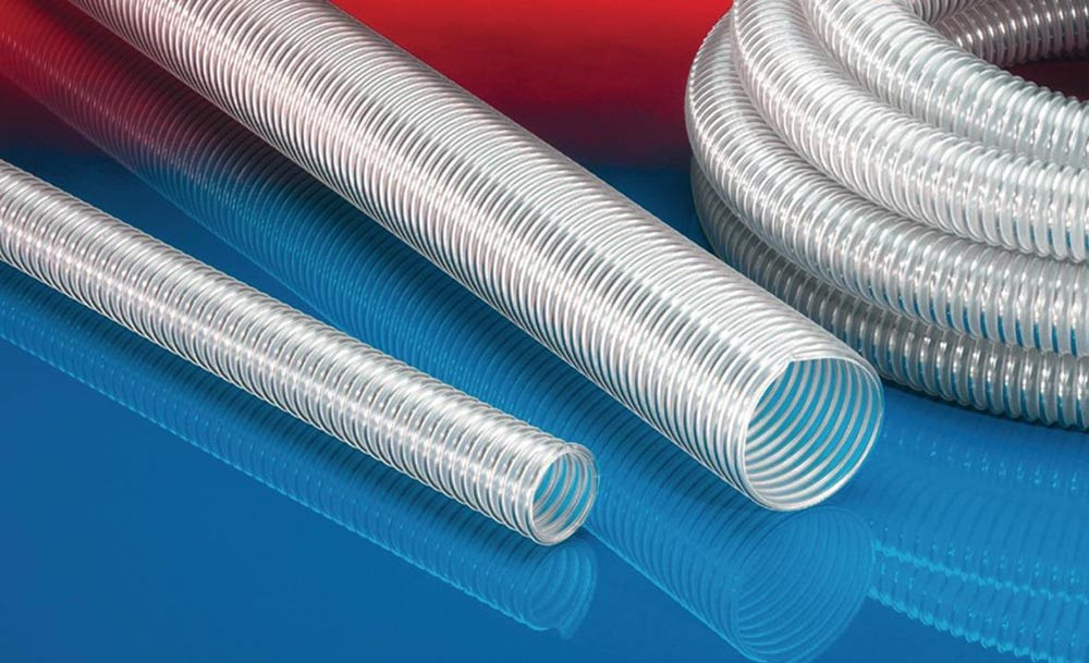 Landwirtschaft: pneumatische Getreideförderer Lebensmittelindustrie · Pharmaindustrie: Lebensmittel · Pharmazeutika Mischer · Trockner · Verpackungsmaschine · Big-Bag Befüllung und Entleerung · Mühle Papierfabrik · Papierindustrie: Schmutzwasser · Abluft Förderung von z.B. Reis · trockene Lebensmittel · Getreideprodukte · Zucker · Milchpulver · Pulver · Kaffee · Tee · Getreide · Mehl · gefrorene Lebensmittel Schlauch für hohen Durchsatz an extrem abrasivem Schüttgut · Granulat · Stein Silo · Silofahrzeug · Tankwagen: Silo Befüllung · Silo Entleerung Tablettenpresse Tierstall: Futtermittelförderung · Futtermittelanlage · Futtermitteltransport Vakuumförderer · Saugförderer · Dosiersystem Lebensmittel Lebensmittelförderung Lebensmittelindustrie Mischer Mühlen Big-Bag-Befüllung und Entleerung Pharmaindustrie Pharmazeutika Saugförderer Silos Silofahrzeuge Silo-Befüllung Silo-Entleerung Tablettenpressen Trockner Tankwagen Vakuumförderer / Vakuumfördergeräte Verpackungsmaschinen Dosiersysteme Ableitfähig Antistatisch Explosionsgefährdete Bereiche Elektrisch leitfähige Schläuche Futtermitteltransport AIRDUC -40°C bis +90°C (+125°C) antistatisch < 10⁹ Ω extrem abriebfester Saugschlauch + Druckschlauch · Polyurethanschlauch FDA und EU konform Wandstärke 2,0 - 2,5mm kundenspez. Sonderaufdruck transparent (Standard) weitere Abmessungen und Längen auf Anfrage lieferbar AIRDUC® Profilschlauch Spirale: Edelstahldraht (INOX) Verstärkung der primären Verschleißzonen Wandung: permanent-antistatisches Premium Ether-Polyurethan (Pre-PUR®) in der Wandung fest eingegossener Federstahldraht Wandstärke ca. 2,0 - 2,5 mm