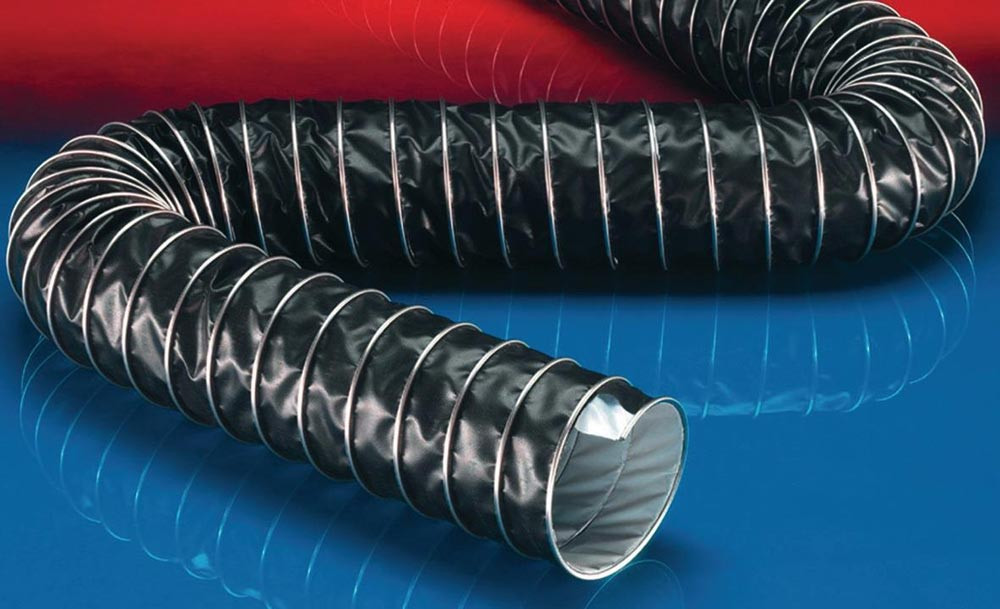 Klemmprofilschlauch, doppellagig (bis +170°C) Anwendungen: · flexibler Schlauch für heiße und kalte Gase und für Stäube, Pulver, Fasern · Chemieindustrie: Chemiedämpfe, Gaspendelschlauch an Verladearm, Farbdämpfe, Farbnebelabsaugung Eigenschaften: Scheuerschutz durch äußeres Klemmprofil · zugfeste Verklemmung der Wandung im Klemmprofil · hochflexibel + stauchbar 4:1 · sehr gut hitzebeständig · antiadhäsiv · gute Laugen- und Säurenbeständigkeit · extrem gute Chemikalienbeständigkeit · RoHS konform Temperaturbereich: · -40°C bis 170°C
