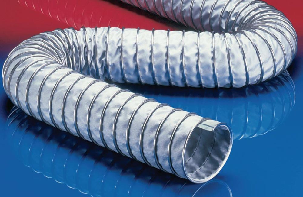 Konstruktion: 1. Klemmprofil-Stützwendel: komplett Edelstahl (INOX), 2. zweilagige Wandung, Wandung: innen und außen mit Edelstahldrähten armiertes und spezialbeschichtetes Glasgewebe
