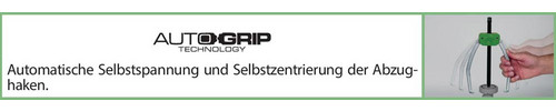 zweiarmig · mit kraftübersetzten, selbstzentrierenden Abzugshaken · besonders geeignet für festsitzende Zahnräder, Ritzel, Kugellager, Riemenscheiben usw. · optimale Anpassung der Spindel an die Welle durch 2-seitige Spindelspitze (Kugel und Spitze)