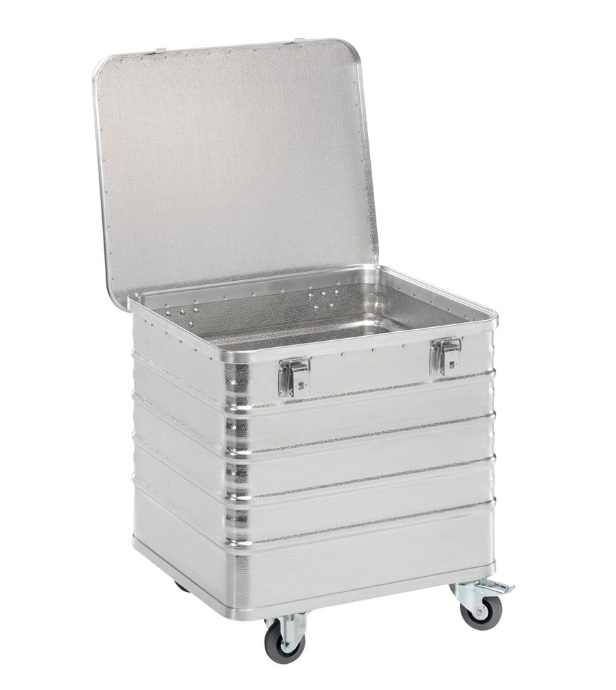 ∙ Aus Aluminium gefertigt und mit trapezförmig ausgeprägten Sicken verstärkt ∙ Umlaufende, sehr stabile Randprofile zur Verstärkung der Wände ∙ Äußerst robust und formstabil ∙ Antistatisch und schmutzabweisend ∙ 2 Lenk- und 2 Bockrollen ∙ Lenkrollen gemäß EN 1757-3 mit Rad-Feststeller