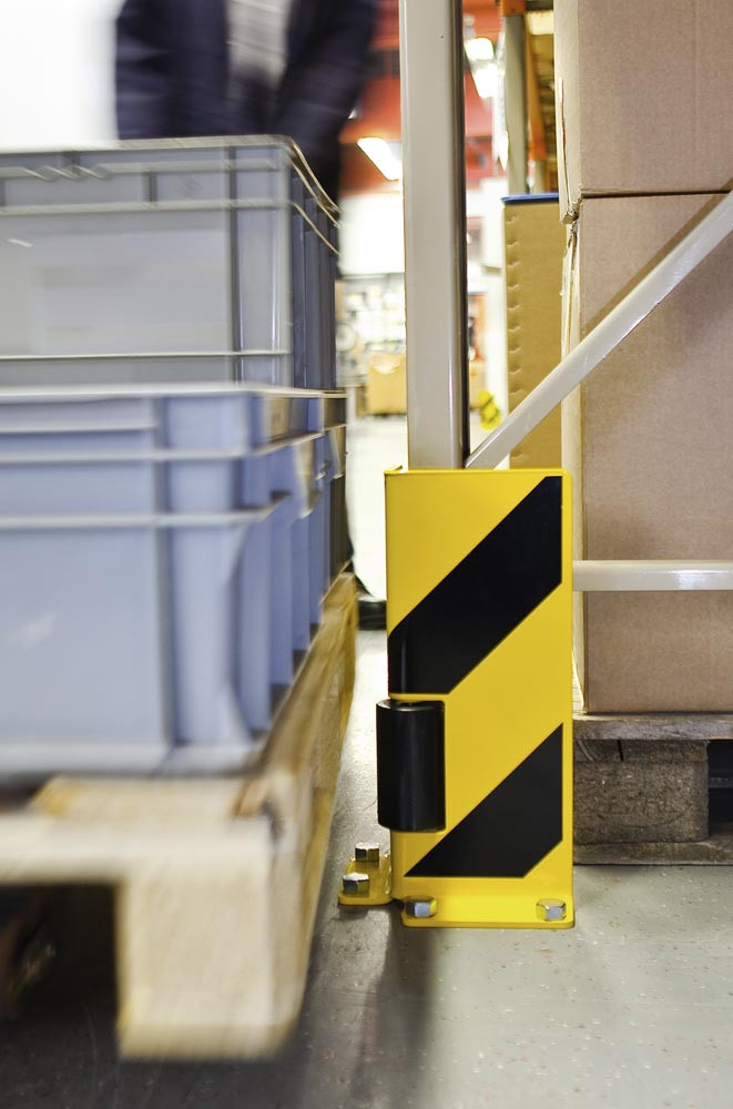 · Schützt die Stützen von Regalen im Eck- und Durchfahrtsbereich· Stahl, gelb kunststoffbeschichtet mit schwarzen Signalstreifen · Polyamid-Rolle, Höhe 110 mm, Anbringung 75 mm über Flur · Rolle leitet den Großteil der einwirkenden Kräfte ab und erhöht die Lebensdauer des Anfahrschutzes · Gestaltung gemäß DGUV-Regel 108-007, ASR A1.3/5.2 und DIN 15512 (Höhe mind. 400 mm)