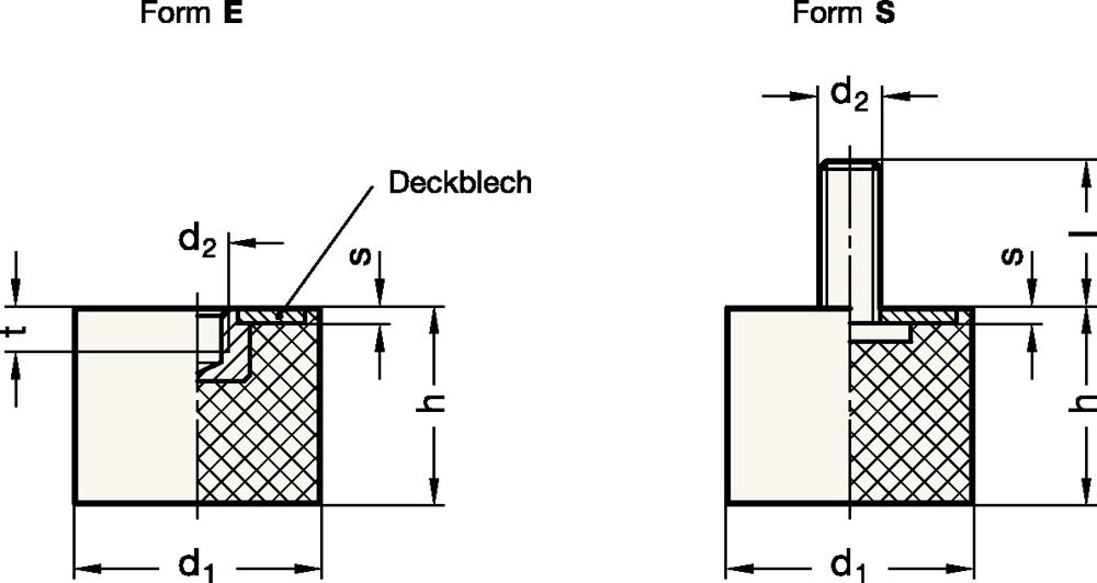 werden als Endanschläge z.B. für Förderwagen verwendet · absorbieren einen Großteil der beim Aufprall wirksamen kinetischen Energie · dabei wirken sie dämpfend, vermeiden zu Schäden führende starke Erschütterungen und minimieren einen Rückprall · nicht zuletzt wirken sie auch lärmdämpfend · diese Anschlagpuffer finden auch Verwendung als Stellfüsse · Ausführung: Gummi Naturkautschuk (NR): auf Deckbleche aufvulkanisiert, temperaturbeständig bis 80 °C · Deckbleche, Gewindebuchsen, Schrauben, Stahl verzinkt, blau passiviert · Gummihärte Shore A ±5, mittel 55