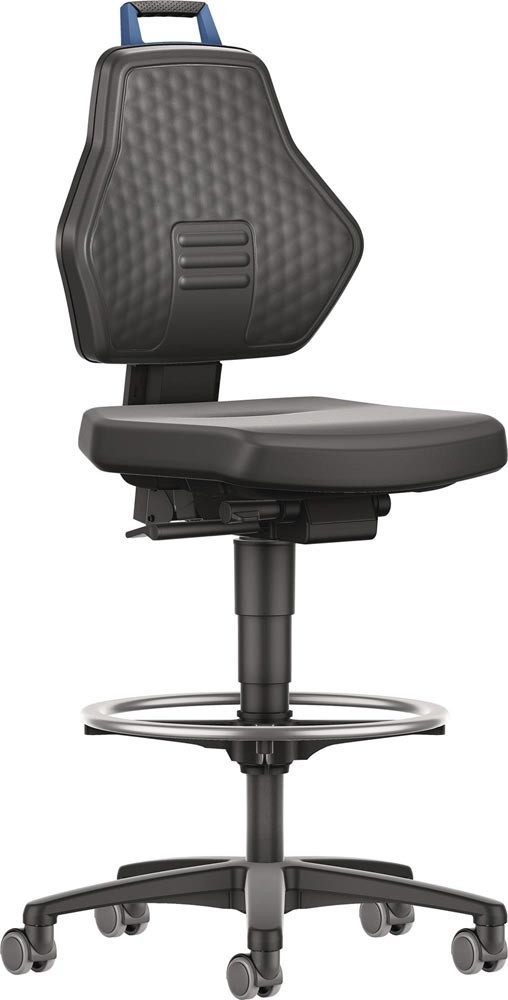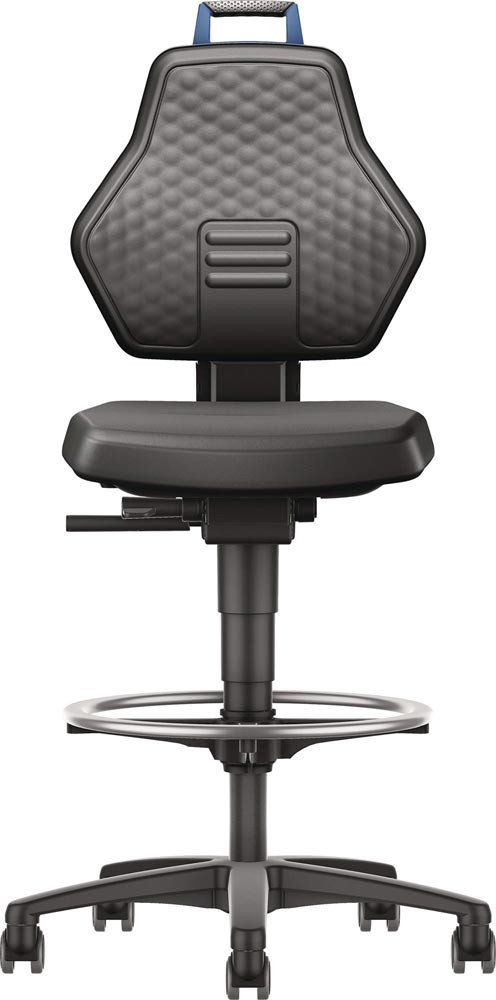 Arbeitsdrehstuhl Rollen + Fußring Kunstleder schwarz Grifffarbe blau 580-860 mm