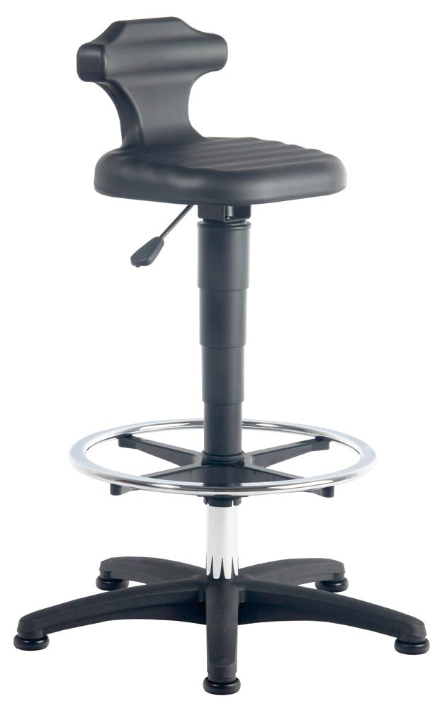 nach DIN 68877 · bedienungsfreundliche Gasfeder-Sitzhöheneinstellung · um 360° drehbar · Sitzfläche mit integrierter Rückenstütze für optimale Entlastung · strukturierte, rutschhemmende Sitz- und Rückenfläche aus softem, schwarzen Integralschaum · Fünffuß-Untergestell aus Kunststoff, flach auslaufend, kipp- und stolpersicher · abriebfeste Kunststoff-Bodengleiter und höhenverstellbarem Fußring, verchromt