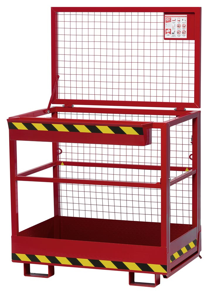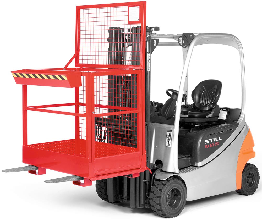 · TÜV geprüfte Sicherheit, entsprechend der DGUV (Deutsche gesetzliche Unfallversicherung) · Stabile Stahlkonstruktion mit rundum Absturzsicherung aus Rohr gemäß UVV · Arbeitskörbe mit TÜV-Zulassung für 2 Personen · Arbeitsplattform aus rutschsicherer Tränenblechkonstruktion mit Abrollschutz · Steckbolzensicherung verhindert das Abrutschen von den Gabelzinken · Pulverbeschichtet · Verzinkte Ausführung auf Anfrage lieferbar ∙ Klappbar auf der Seite der Einfahrtaschen