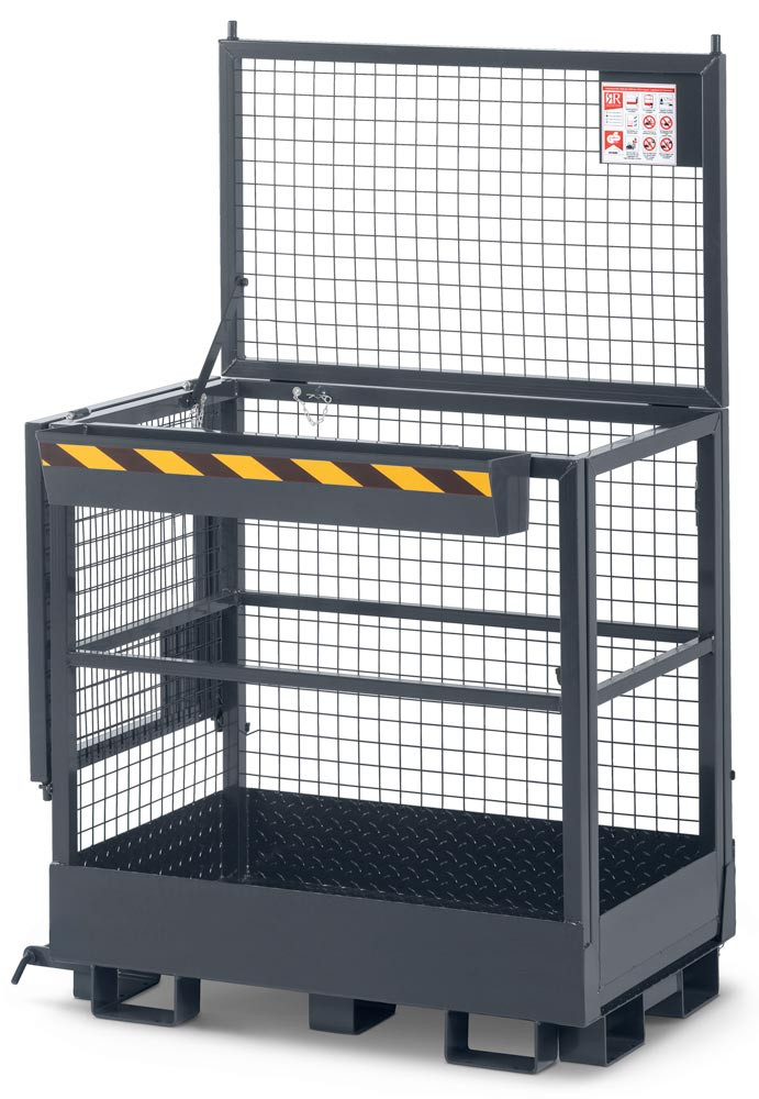 · TÜV geprüfte Sicherheit, entsprechend der DGUV (Deutsche gesetzliche Unfallversicherung) · Stabile Stahlkonstruktion mit rundum Absturzsicherung aus Rohr gemäß UVV · Arbeitskörbe mit TÜV-Zulassung für 2 Personen · Arbeitsplattform aus rutschsicherer Tränenblechkonstruktion mit Abrollschutz · Steckbolzensicherung verhindert das Abrutschen von den Gabelzinken · Pulverbeschichtet · Verzinkte Ausführung auf Anfrage lieferbar ∙ Klappbar auf der Seite der Einfahrtaschen