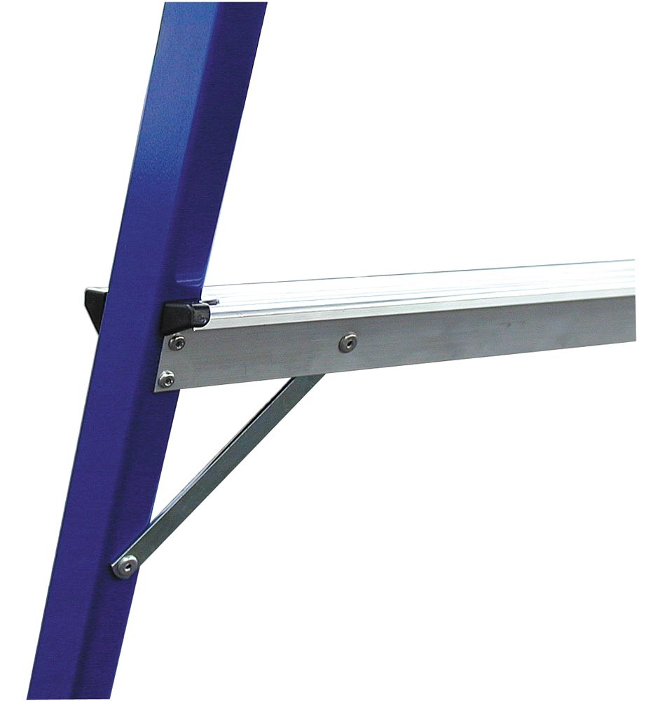 ∙ Breite, rutschsichere Fußkappen für zusätzliche Standsicherheit ∙ Alu-Holme pulverbeschichtet (blau) ∙ Rutschsichere, wasserfeste Phenolharz-Siebdruck-Platte (1090 x 300 mm) ∙ Ausgestattet mit zwei Sicherheitsverriegelungen die automatisch beim Aufklappen einrasten ∙ Platzsparend zu verstauen, handlich und leicht (ca. 8,0 kg) ∙ Platzsparend zu verstauen, handlich und leicht (ca. 8,0 kg) ∙ Profilierte, rutschfeste 80 mm tiefe Alu-Stufen für sicheren Aufstieg und bequemen Stand ∙ 4 stabile Eckverstrebungen für größere Stabilität ∙ Bis Arbeitshöhe von ca. 2,50 m