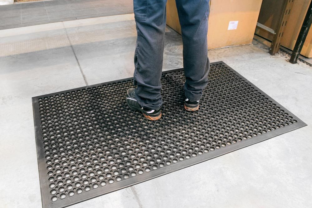 ∙ Ergonomiearbeitsplatzmatte aus SBR/NBR-Gummi mit durchbrochener Oberfläche ∙ Vielseitig einsetzbar ∙ Rutschhemmung R10 nach EN 13552 ∙ Materialstärke 12,5 mm ∙ 25 % Nitrilgummianteil