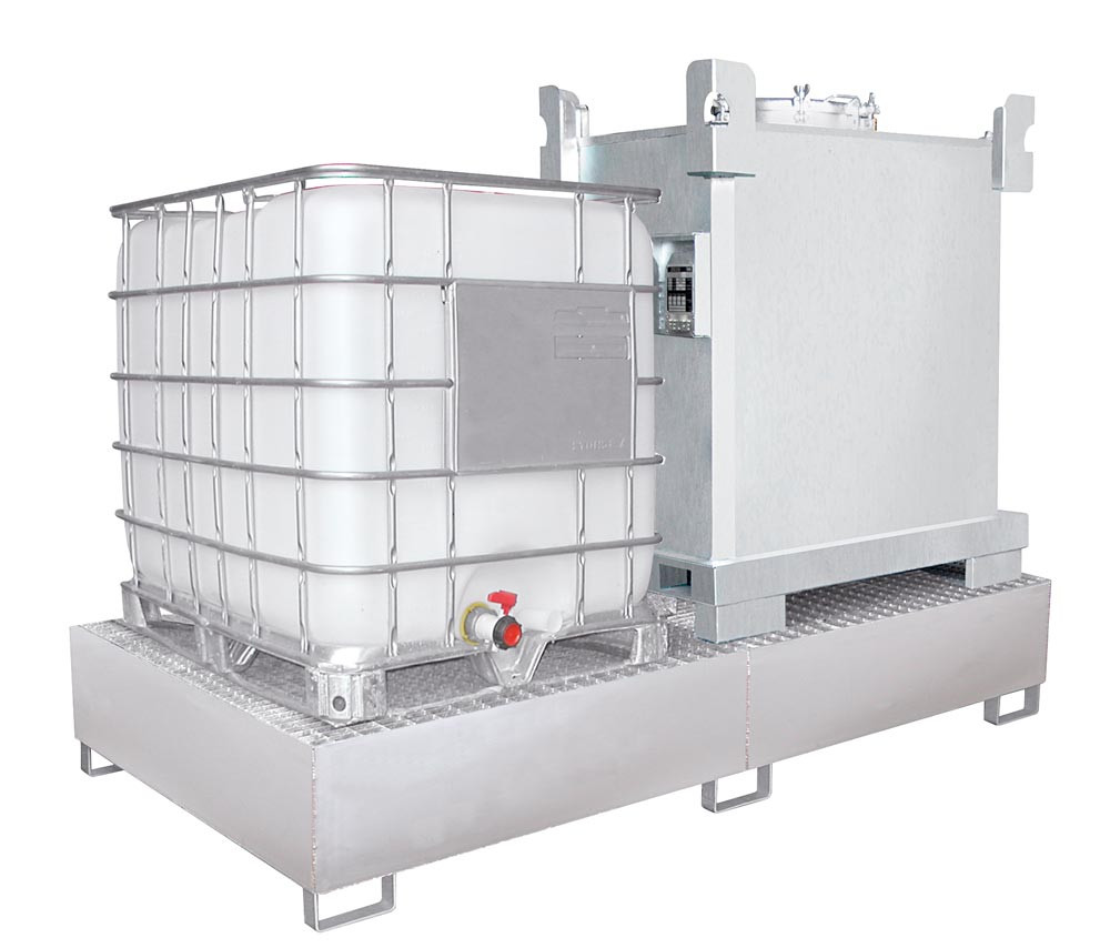 Auffangwanne, 2 mm Edelstahl, für 1 St. 1000-l-IBC, stehend Lagern, BxTxH 1460x1460x620 mm, Auffangvolumen 1000 l E810694