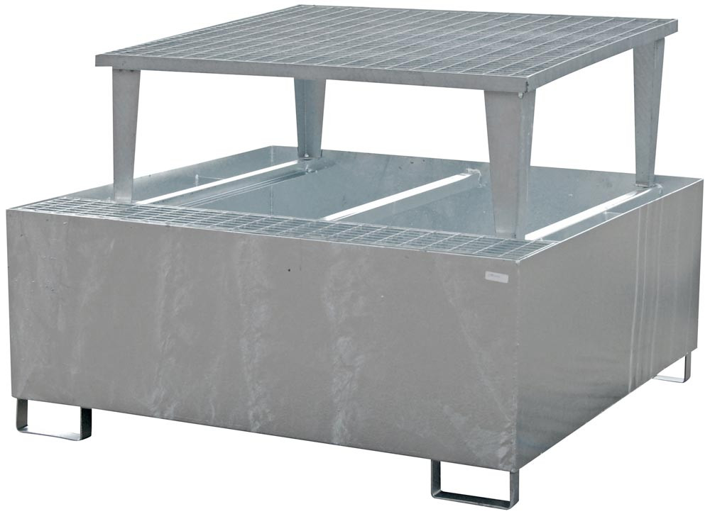 ∙ Auffangwannen aus 3 mm Stahlblech mit verzinktem Gitterrost ∙ Auffangvolumen 1000 Liter ∙ Stützfüße 100 mm Unterfahrhöhe