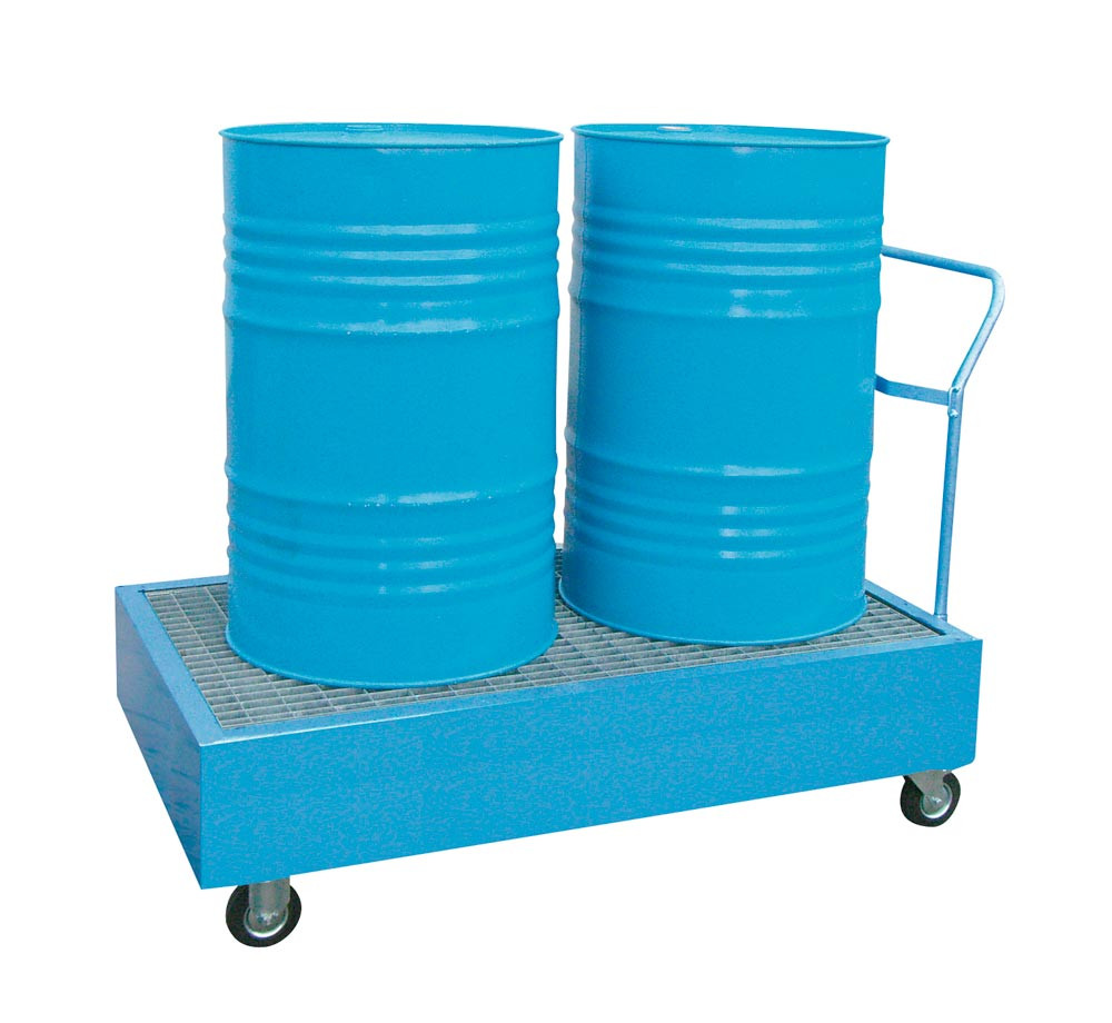 Auffangwanne aus 3 mm Stahlblech, RAL 5015, fahrbar, für 2 St. 200-l-Fass, stehende Lagerung, BxTxH 800x1400x405 mm, Auffangvolumen 220 l