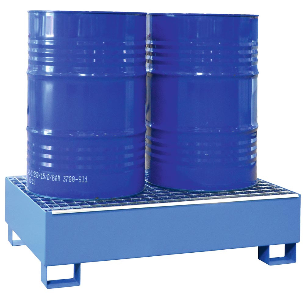 Auffangwanne aus 3 mm Stahlblech, RAL 5015, für 2 Stück 200-l-Fass, stehende Lagerung, Auffangvolumen 210 l, BxTxH 1250x820x340 mm