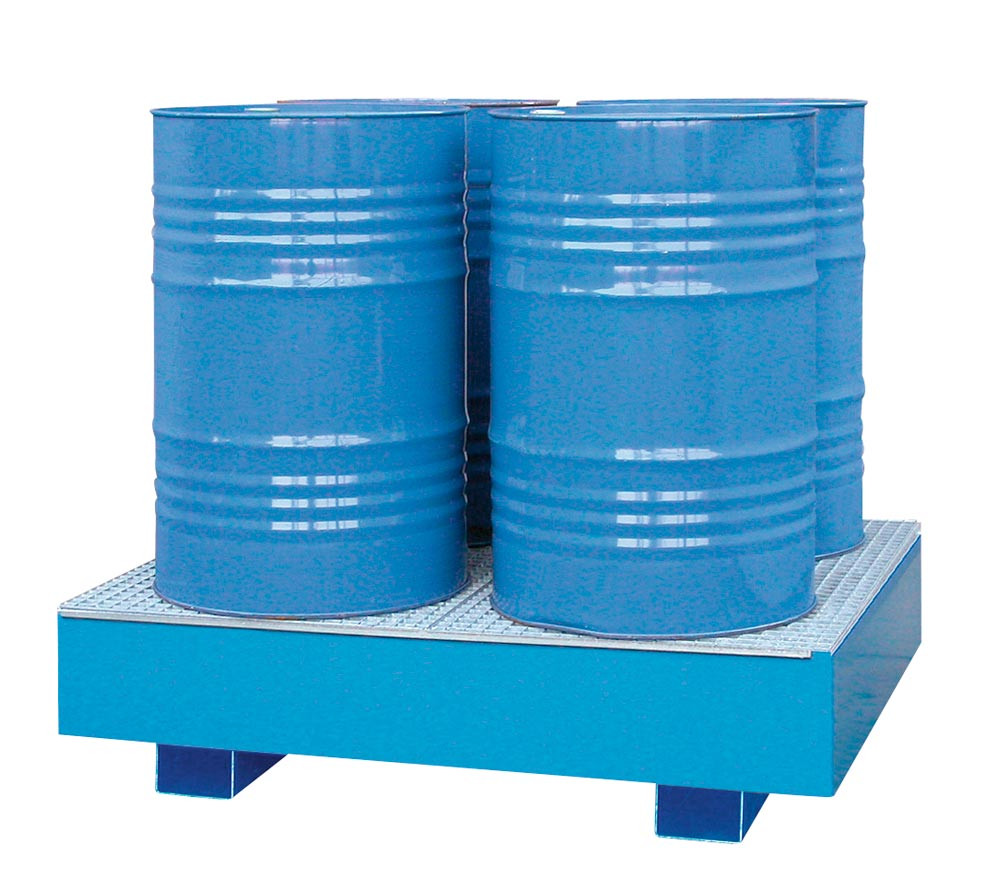 · Zur Lagerung von wassergefährdenden und entzündbaren Flüssigkeiten · Wannen hergestellt aus 3 mm Stahlblech · Mit herausnehmbaren, verzinkten Gitterrosten · Wahlweise in RAL 5015 himmelblau oder feuerverzinkt lieferbar · Zur Lagerung von Säuren und Laugen sind PE-Wanneneinsätze optional lieferbar