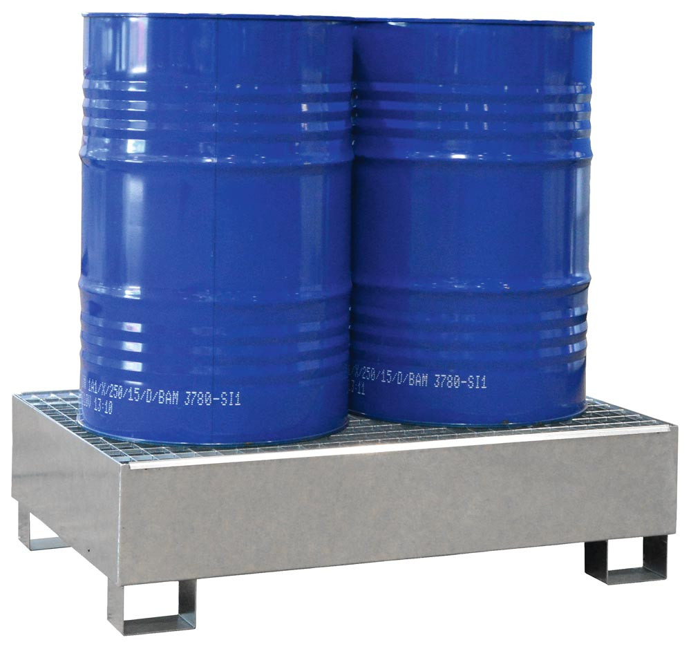 Auffangwanne aus 3 mm Stahlblech, verzinkt, für 2 Stück 200-l-Fass, stehende Lagerung, Auffangvolumen 210 l, BxTxH 1250x820x340 mm E1981480