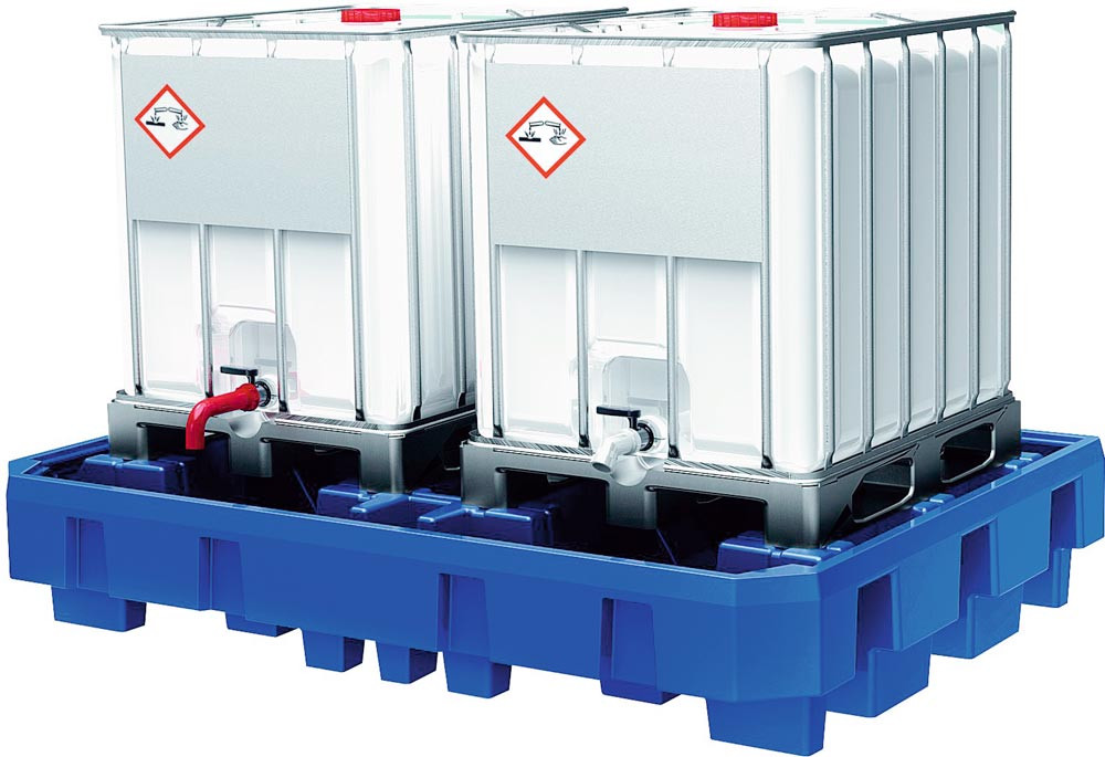 ∙ Die Wannen vereinen hohe Stabilität mit großer Variationsmöglichkeit und bieten hohe Beständigkeit gegen Öle, Säuren, Laugen etc. ∙ Zur Lagerung von Kubischen-Tank-Containern (KTC/IBC) geeignet ∙ Mit allgemeiner bauaufsichtlicher Zulassung des DIBt-Berlin ∙ Zur sicheren und vorschriftsmäßigen Lagerung wassergefährdender Flüssigkeiten aller Gefährdungsklassen ∙ Nicht zur Lagerung entzündbarer Flüssigkeiten zugelassen ∙ Mit Einfahrtaschen für einen leichten und sicheren innerbetrieblichen Transport der leeren Auffangwanne ∙ Farbe blau ∙ Traglast je Stellplatz 2000 kg