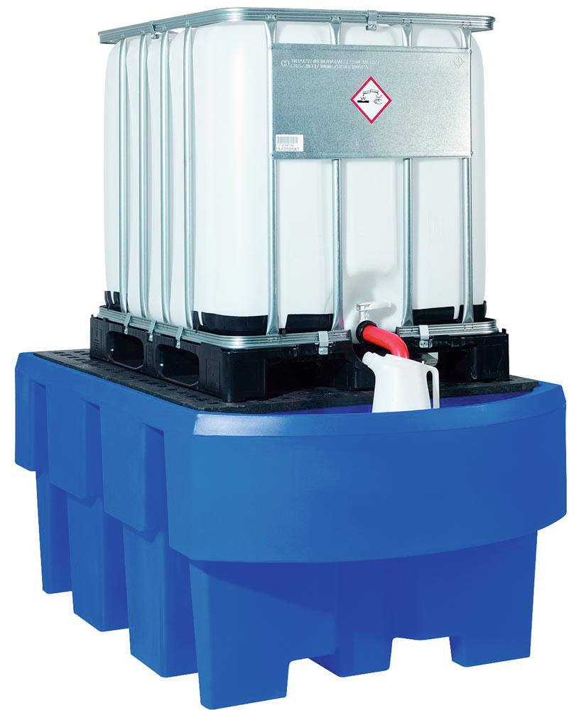 Auffangwanne aus Polyethylen für IBC, verz. Gitterrost, Volumen 1000 l, BxTxH 1280x1910x870 mm, für 1 IBC, blau