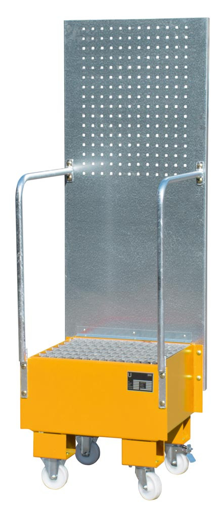 Auffangwanne mit Lochplatte, 3 mm Stahlblech, RAL 2000, fahrbar, für 1 St. 60-l-Fass, stehend Lagern, BxTxH 570x590x1775 mm, Auffangvol. 60 l