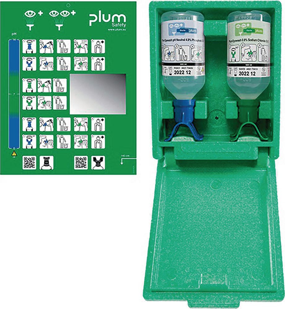 staubgeschützte Wandbox mit 1 x 0,5 l pH Neutral DUO (4,9 % Phosphatpufferlösung) und 1 x 0,5 l Augenspüllösung DUO (0,9 % Natriumchloridlösung) · die Flaschen sind mit einem Augenaufsatz zum gleichzeitigen Spülen beider Augen ausgestattet