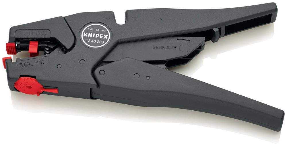 selbsteinstellend · für ein-, mehr- und feindrähtige Leiter mit Kunststoff- oder Gummiisolation · Drahtschneider für Cu- und Al-Leiter mehrdrähtig bis 10 mm² und eindrähtig bis 6 mm² · Messer und Kunststoff-Klemmbacken leicht auswechselbar · Gehäuse: aus glasfaserverstärktem Kunststoff · Messer: Spezial-Werkzeugstahl, ölgehärtet