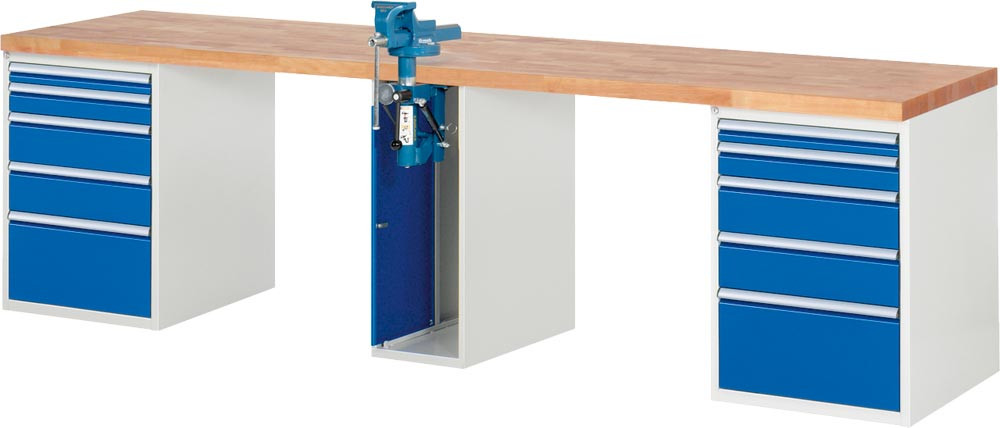 Baukastenwerkbank, BxTxH 2500x700x890 mm, Platte Buche , 2 Blocks, 1 Schraubstock, 10 Schubl. 2x60 mm, 2x90 mm, 4x150 mm, 2x270 mm, RAL 7035/5010 E6490606