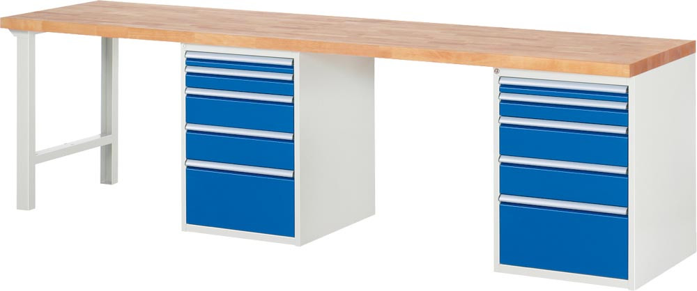 Baukastenwerkbank, BxTxH 2500x700x890 mm, Platte Buche 40 mm, 2 Blocks, 10 Schubladen 2x60 mm, 2x90 mm, 4x150 mm, 2x270 mm, RAL 7035/5010 E6490598
