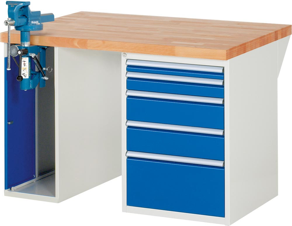 Baukastenwerkbank, Platte Buche 40 mm, 5 Schubladen: 60,90, 2x150, 270 mm, 1 Schrank. m. Schraubstock, BxTxH 1250x900x890 mm, RAL 7035/5010