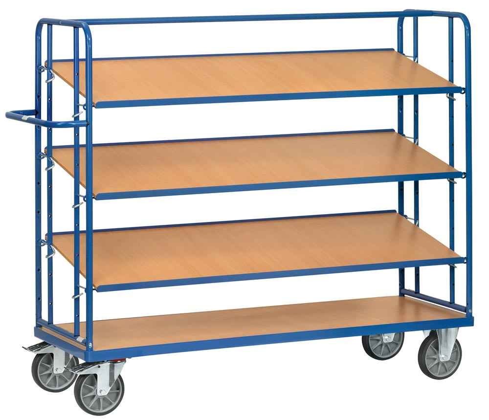 Beistell- und Kommissionierwagen, 4 Holzböden, Ladefläche LxB 1250x610 mm, Außenmaße 1430x620x1560 mm, Traglast 500 kg, RAL 5007 brillantblau