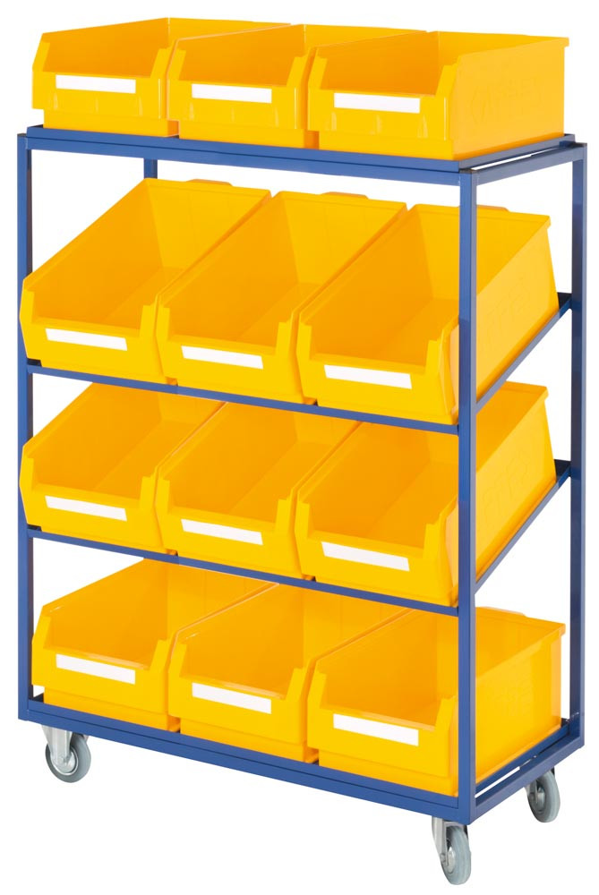 Beistell- und Kommissionierwagen, LxBxH 1015x485x1315 mm, 2/2 gerade/schräge Böden, 12 Kästen Gr. 2 gelb, Traglast 230 kg