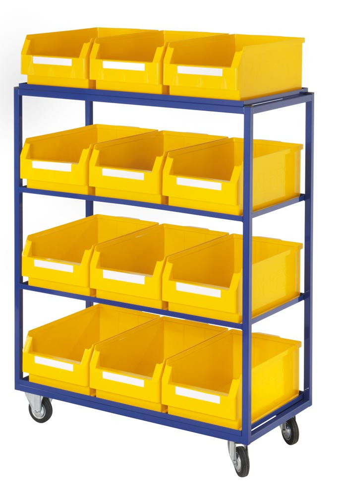 Beistell- und Kommissionierwagen, LxBxH 1015x485x1315 mm, 4 gerade Böden, 12 Kästen Gr. 1 gelb, Traglast 230 kg