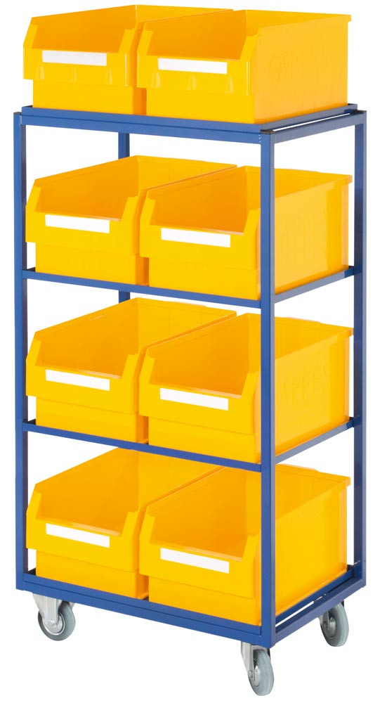 Beistell- und Kommissionierwagen, LxBxH 700x485x1315 mm, 4 gerade Böden, 8 Kästen Gr. 1 gelb, Traglast 230 kg