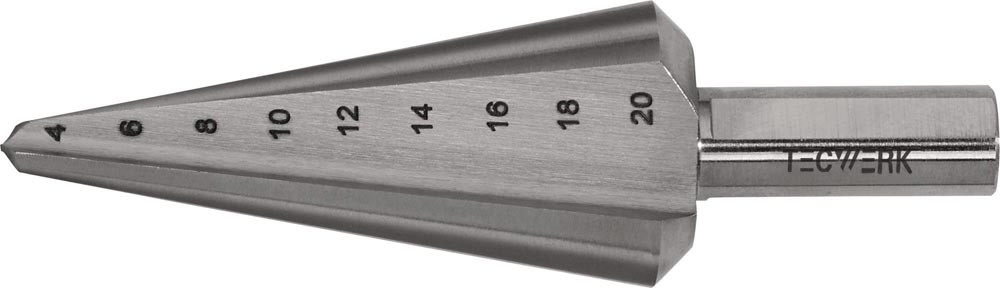 Schaft mit 3 Spannflächen · mit 2 Schneiden · Senkwinkel 20 ° · konisch ansteigende Schneiden radial hinterschliffen, dadurch wird ein schälender Schnitt erzielt · Universalwerkzeug mit breitem Anwendungsbereich, besonders für die Blechbearbeitung, aber auch für Kunststoffe geeignet · auf jeder Bohrmaschine verwendbar