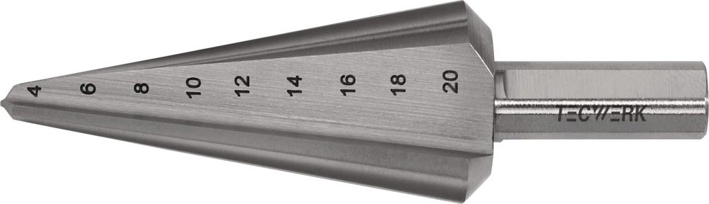 Schaft mit 3 Spannflächen · mit 2 Schneiden · Senkwinkel 20 ° · konisch ansteigende Schneiden radial hinterschliffen, dadurch wird ein schälender Schnitt erzielt · Universalwerkzeug mit breitem Anwendungsbereich, besonders für die Blechbearbeitung, aber auch für Kunststoffe geeignet · auf jeder Bohrmaschine verwendbar