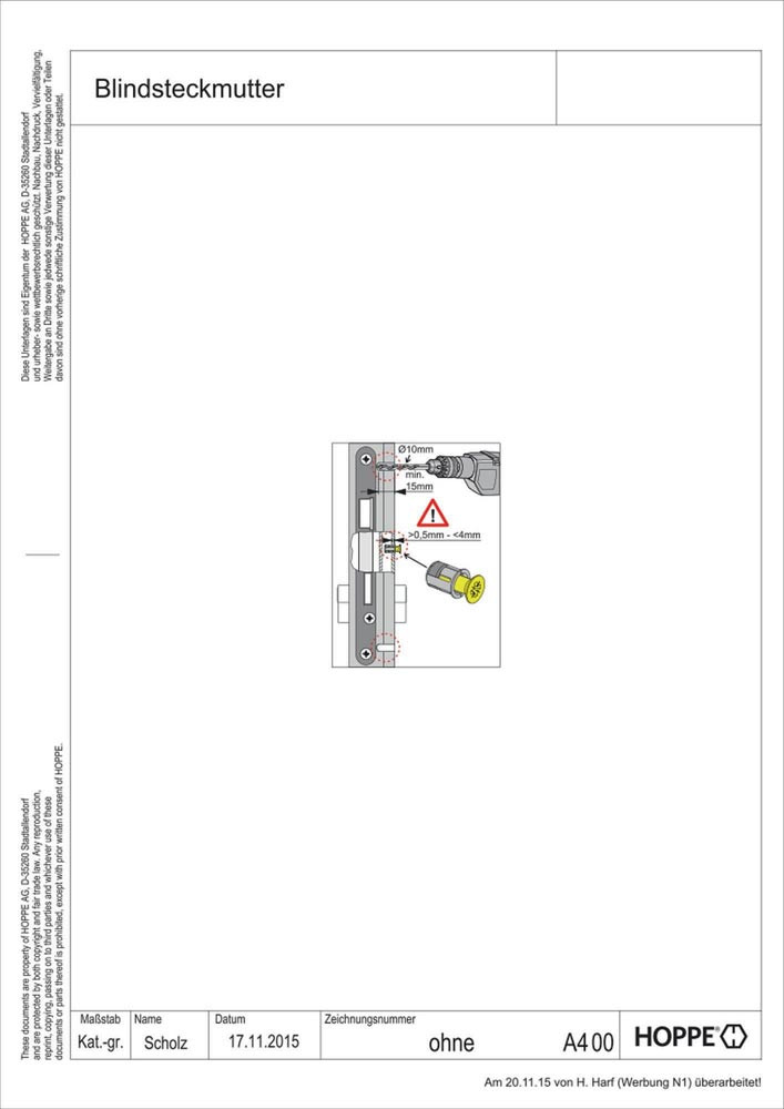 Eisen-Blindsteckmutter M5: für die Befestigung der (E)44er- · (E/K/M)55er-HOPPE-Schmalrosetten (außer Klebe- und Schieberosetten) an Aluminium-Profiltüren · Inhalt: 50 St.