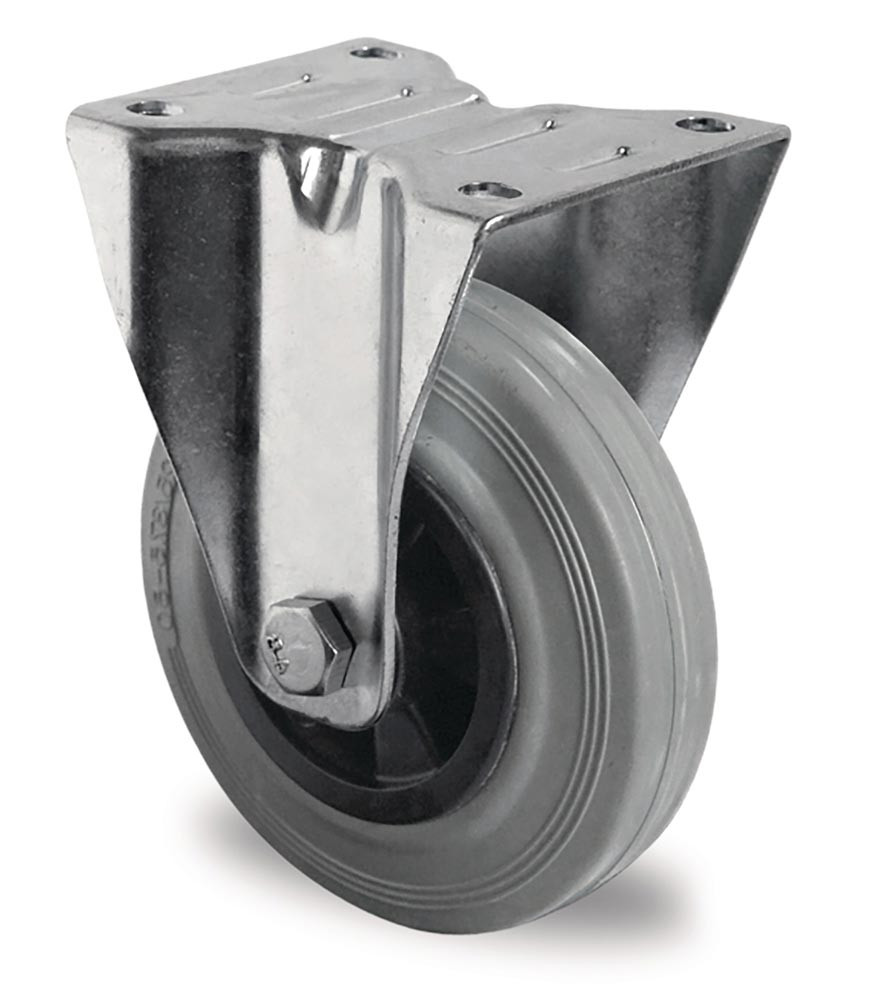 Transportgeräterolle · Radkörper: Polypropylen schwarz · Vollgummireifen grau 85° Shore A · Rollenlager · geräuscharm · mit Plattenbefestigung · für Indoor und Outdoor