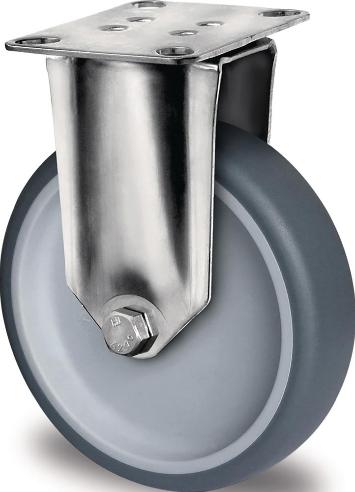 Edelstahl-Bockrolle · Radkörper: Polypropylen grau · thermoplastische Bereifung Elastomer 95° Shore A grau · Gleitlager · rostfrei · geräuschreduziert · mit Plattenbefestigung