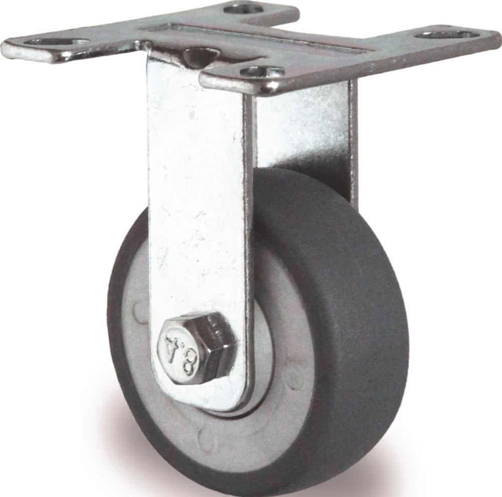 Apparaterolle · Gehäuse aus Stahlblech, galvanisch blau verzinktes Stahlblechgehäuse · korrosionsunempfindlich · thermoplastische Gummibereifung (grau) auf Kunststoff-Felge · Kugellager · mit Plattenbefestigung