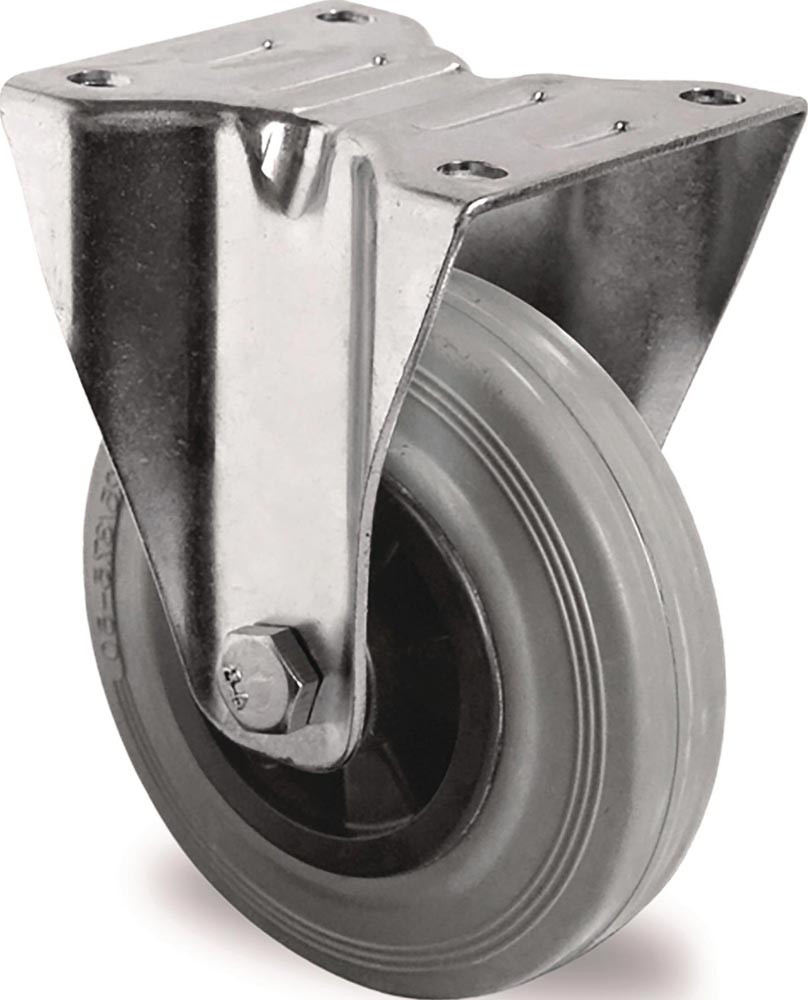 Transportgeräterolle · Radkörper: Polypropylen schwarz · Vollgummireifen grau 85° Shore A · Rollenlager · geräuscharm · mit Plattenbefestigung · für Indoor und Outdoor