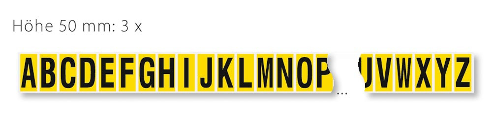 Buchstaben A-Z, selbstklebend, Schrifthöhe 50 mm, VE 208 Etiketten mit 8xA-Z, Schrift schwarz, Etikett gelb