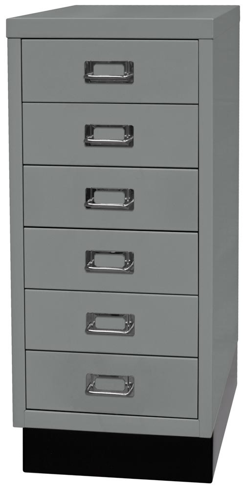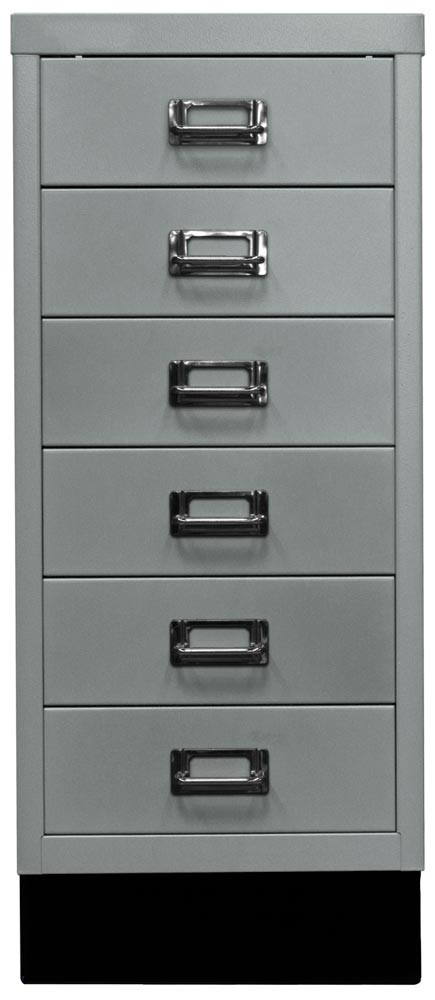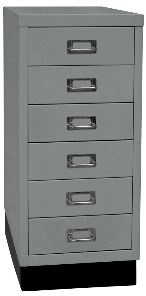 Büro-Schubladenschrank, BxTxH 279x380x670 mm, 6 Schubladen 87 mm, DIN A4, Sockel 80 mm hoch, silber