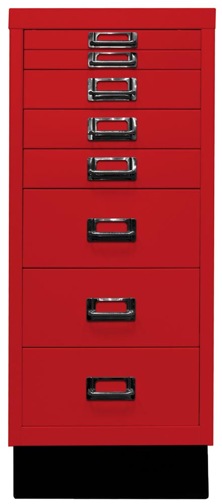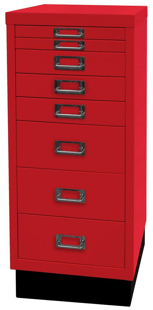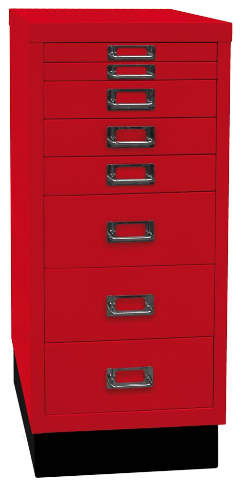 Büro-Schubladenschrank, BxTxH 279x380x670 mm, 8 Schubladen 2x25, 3x51, 3x102 mm, DIN A4, Sockel 80 mm hoch, kardinalrot
