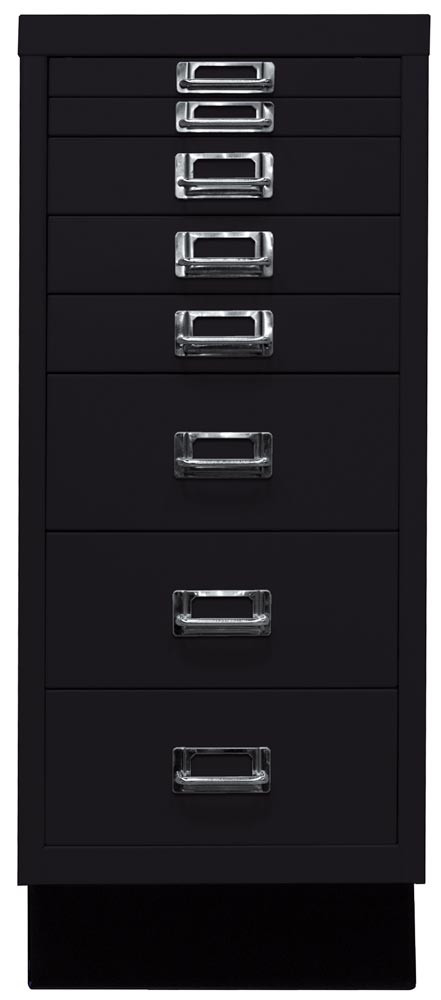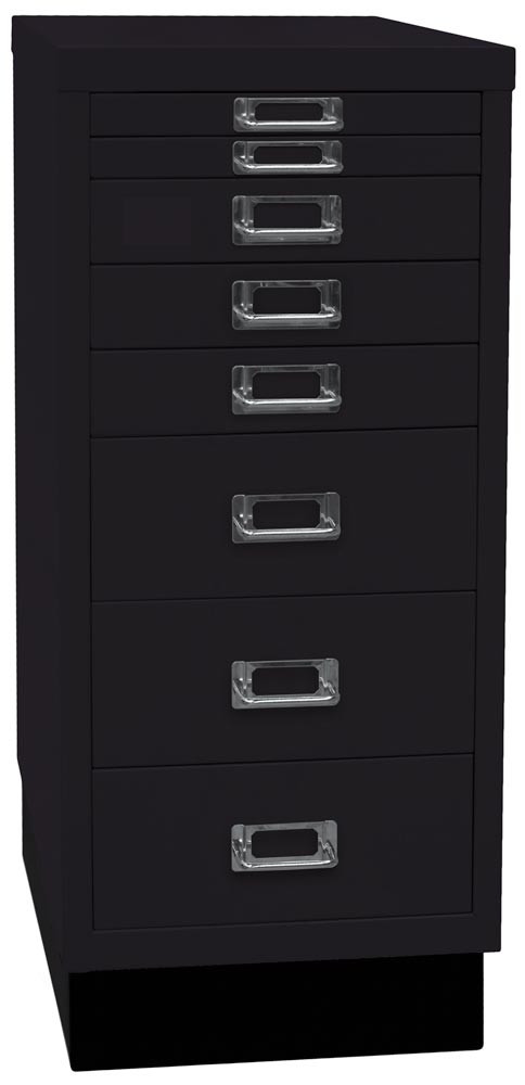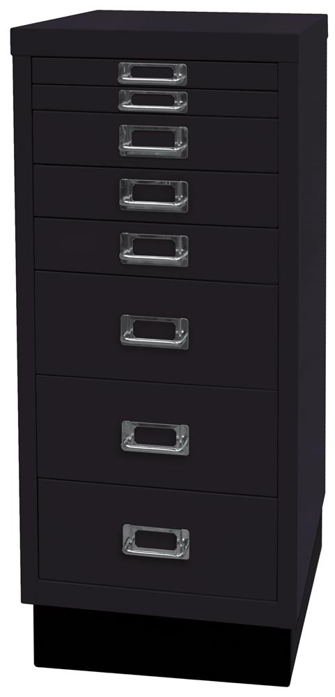 Büro-Schubladenschrank, BxTxH 279x380x670 mm, 8 Schubladen 2x25, 3x51, 3x102 mm, DIN A4, Sockel 80 mm hoch, schwarz