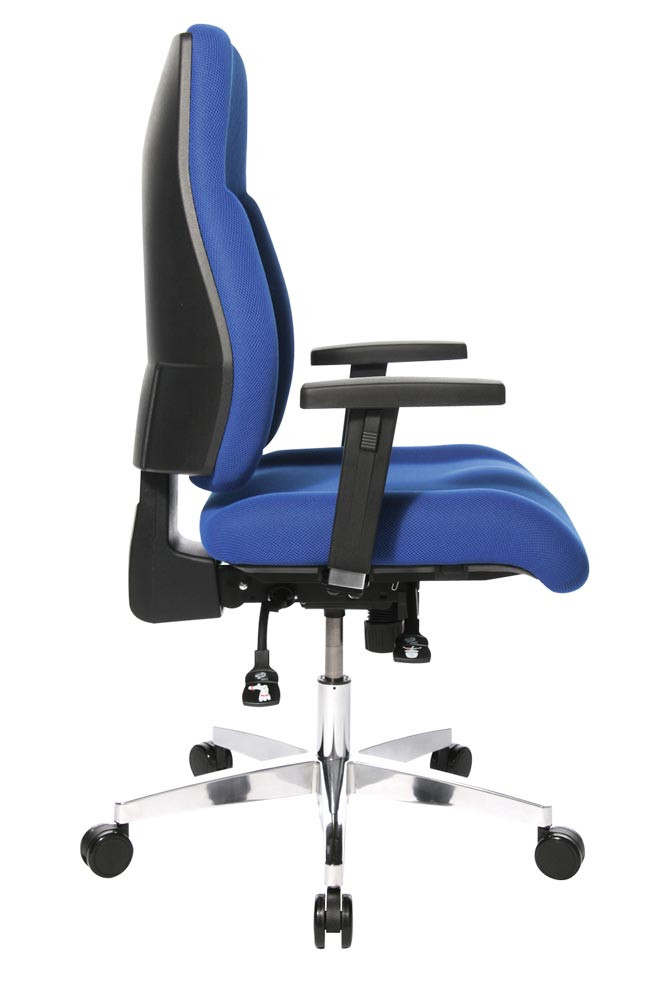 mit Punkt-Synchron-Technik (ohne Armlehnen) · für überwiegend sitzende Tätigkeiten · Aluminiumfußkreuz poliert · ergonomische Rückenlehne mit seitlichen Polster zur Fixierung des Rückens · Muldensitz mit Sitztiefenverstellung und mit seitlichen Polstern zur Fixierung des Beckenbereichs · stufenlos höhenverstellbar ∙ Bezug 100 % Polyester · Sitzfläche B 480 x T 480 mm · Lehnenhöhe 600 mm · Rollen für weiche Böden Lieferung erfolgt zerlegt