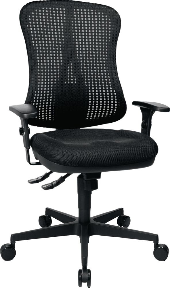 mit Punkt-Synchron-Technik (mit Armlehnen) · für überwiegend sitzende Tätigkeiten · Kunststofffußkreuz, schwarz · ergonomisch taillierte Rückenlehne, über Rastermechanik verstellbar, mit integrierte Lendenwirbelstütze · Körpergewichtseinstellung individuell einstellbar, mehrfach arretierbar · mit bequemen Muldensitz · Armlehnen höhenverstellbar · Bezug Polster 100% Polyester, Netzrückenlehne 100% Polyester · Sitzfläche B 470 x T 470 mm · Sitzhöhe 390-510 mm · Lehnenhöhe 590 mm · Rollen für weiche Böden