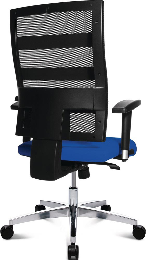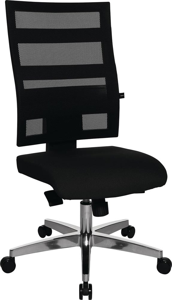 mit Punkt-Synchron-Technik (ohne Armlehnen) · für überwiegend sitzende Tätigkeiten · Aluminiumfußkreuz poliert · Rückenlehne mit atmungsaktiver Netzbespannung schwarz, Rückseite mit elastischen Gummibändern, höhenverstellbar · Flachsitz mit komfortabler Knierolle · Bezug Rückenlehne 100 % Polyester, Sitzfläche 100 % Trevira CS · Sitzfläche B 480 x T 480 mm · Lehnenhöhe 600 mm · Rollen für weiche Böden · Lieferung erfolgt zerlegt