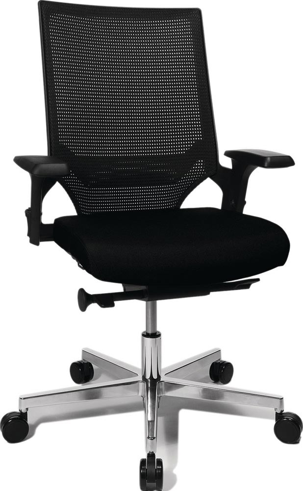 mit Punkt-Synchron-Technik (mit Armlehnen) · für überwiegend sitzende Tätigkeiten · Aluminiumfußkreuz poliert · Rückenlehne mit atmungsaktiver Netzbespannung schwarz, mit höhenverstellbarer Lendenwirbelstütze · Rückenlehne in Höhe und Neigung stufenlos verstellbar · Sitz höhenverstellbar · ergonomischer Muldensitz mit Sitztiefenverstellung · Bezug 100 % Trevira CS · Sitzfläche B 450 x T 440 mm · Lehnenhöhe 560 mm · Rollen für weiche Böden · Lieferung erfolgt zerlegt