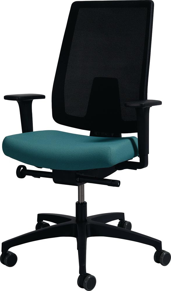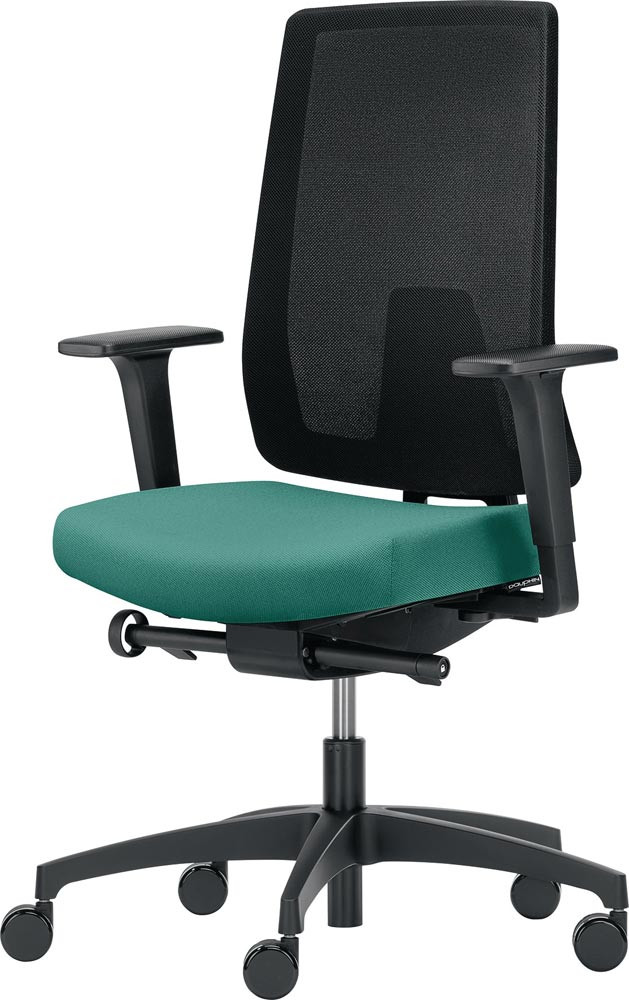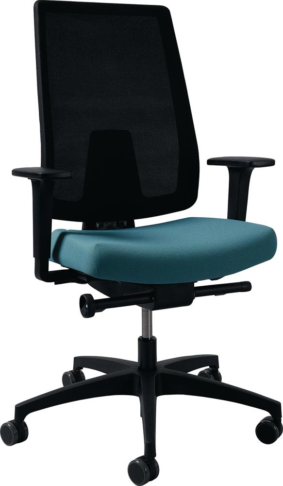 mit Synchrontechnik (mit Armlehnen) · für überwiegend sitzende Tätigkeiten · belastbar bis 150 kg Körpergewicht · stabiles Kunststofffußkreuz, schwarz · hohe höhenverstellbare atmungsaktive Netzrückenlehne schwarz, 100 % Polyester · Armlehnen höhen- und breitenverstellbar, mit PU-Auflage · seitliche Einstellung des Rückenlehnendrucks im Sitzen mittels Handrad · Sitzbezug 100 % Polyester · Sitzfläche B 470 x T 380-440 mm · Sitztiefenverstellung 80 mm mittels Schiebesitz · Lehnenhöhe 610-680 mm · Universalrollen für weiche und harte Böden